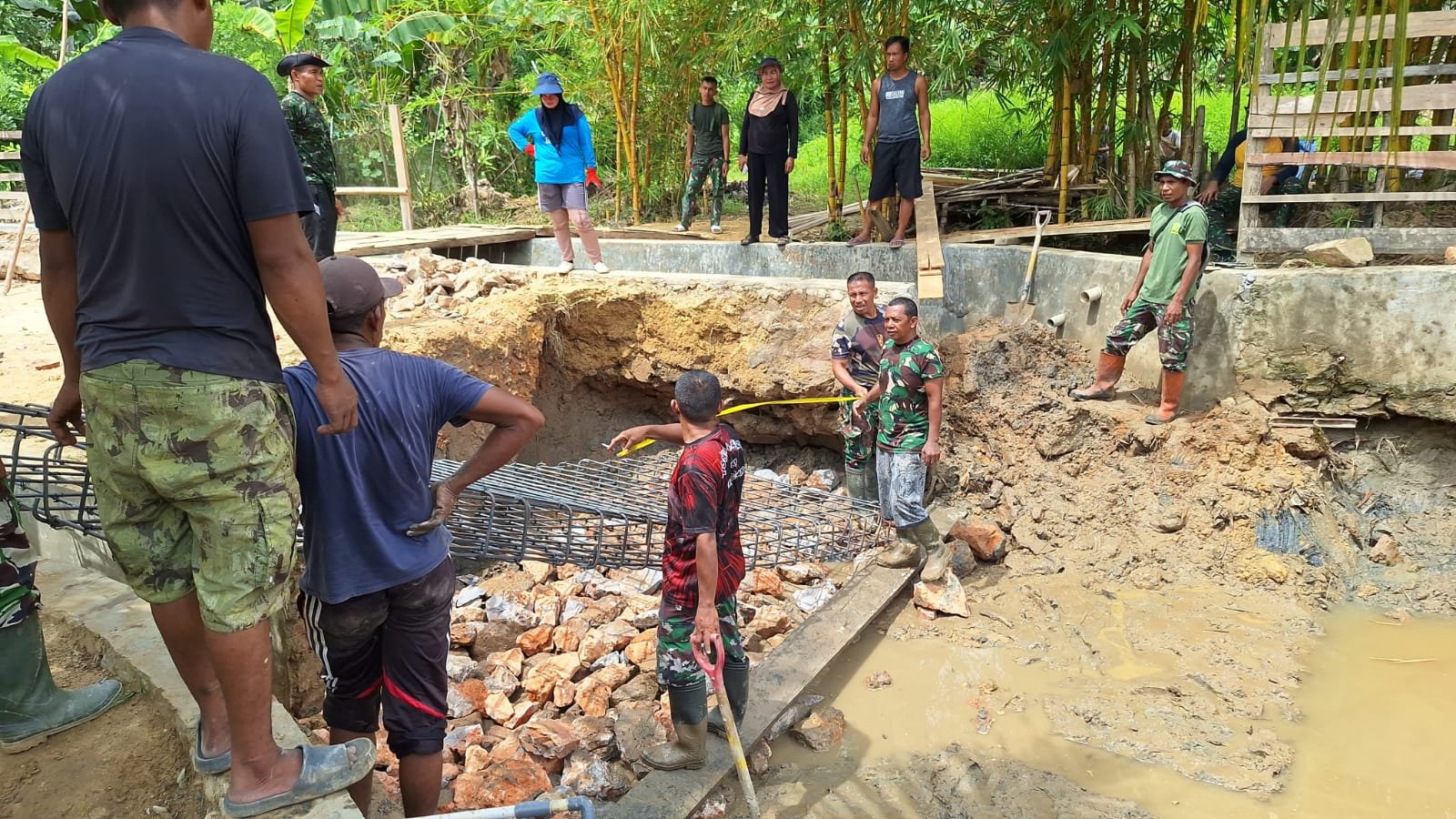 Kendari — Semangat gotong royong kembali terlihat dalam pembangunan jembatan program TMMD ke-127, ketika seorang ibu rumah tangga dengan penuh energi ikut membantu proses pengecoran bersama prajurit TNI, Sabtu (14/2).