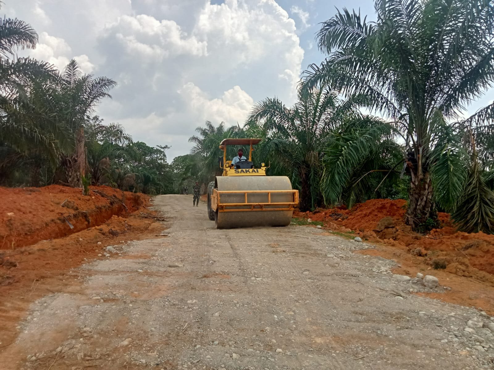 Sejumlah prajurit TNI tampak mengarahkan alat berat, sementara mesin vibro bergerak maju mundur memadatkan timbunan tanah di sepanjang jalur yang telah dibentuk.