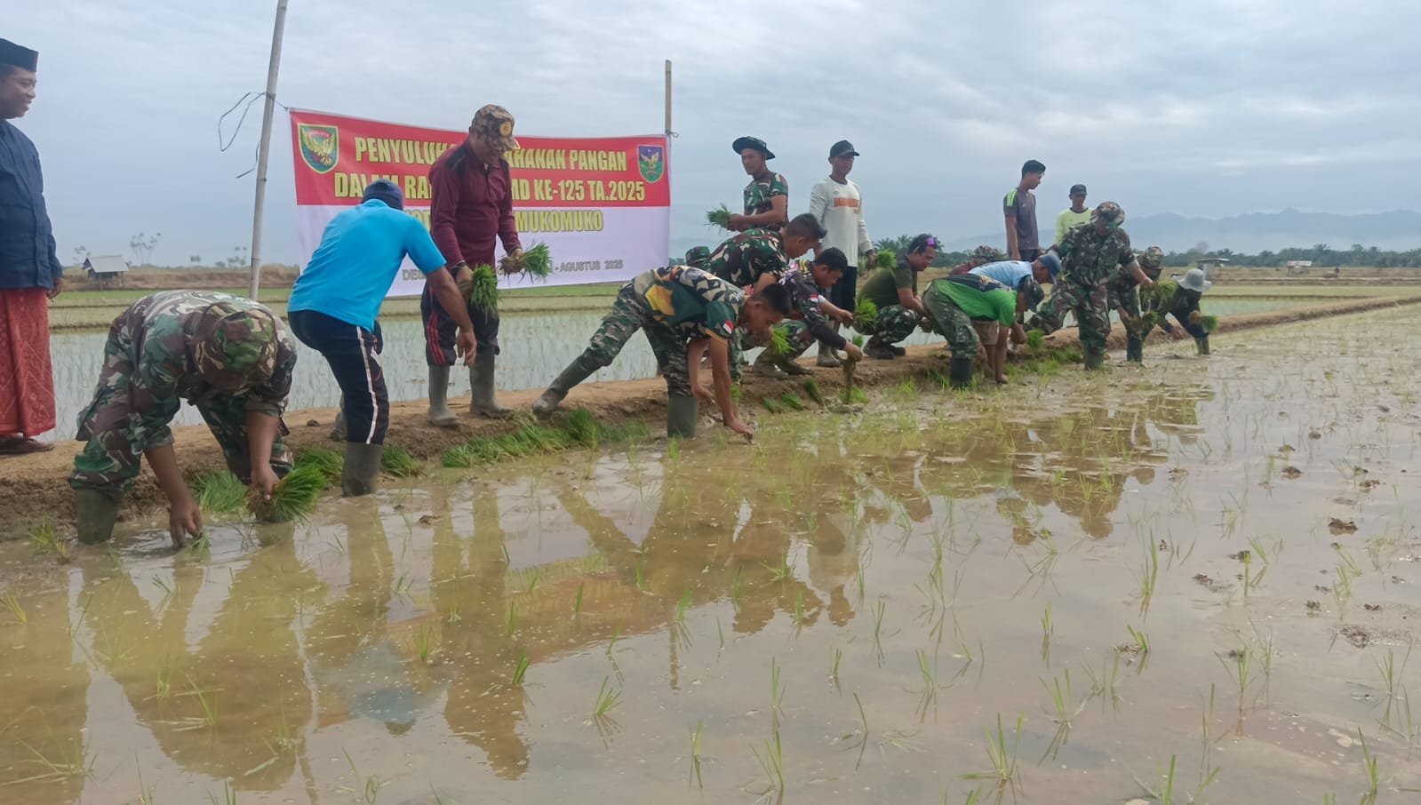 Mukomuko – Pemandangan unik terlihat di Desa Sumber Makmur, Kecamatan Lubuk Pinang, Selasa (19/08/2025). Anggota Satgas TMMD Reguler ke-125 Kodim 0428/Mukomuko tampak bahu-membahu bersama para petani setempat menanam padi di sawah.