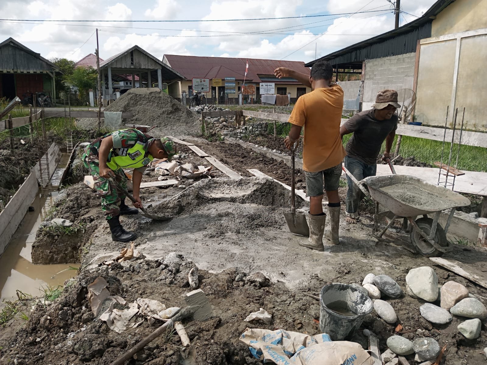 Koptu Usman Melaksanakan Gotong royong membantu warga mengaduk semen untuk pembuatan Pondasi Rumah warga binaan .ini di lakukan untuk menjaga hubungan baik antara TNI dengan Rakyat .