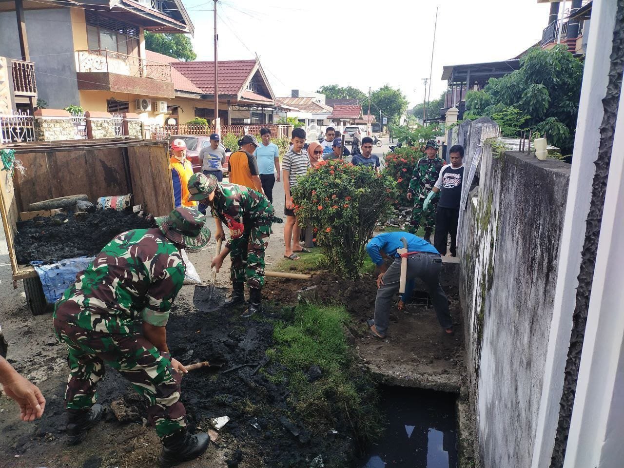 Saluran air di lingkungan perumahan menjadi sasaran utama pembersihan, di mana personel TNI dan warga bahu-membahu mengangkat sampah, lumpur, dan material lain yang menyumbat aliran air.