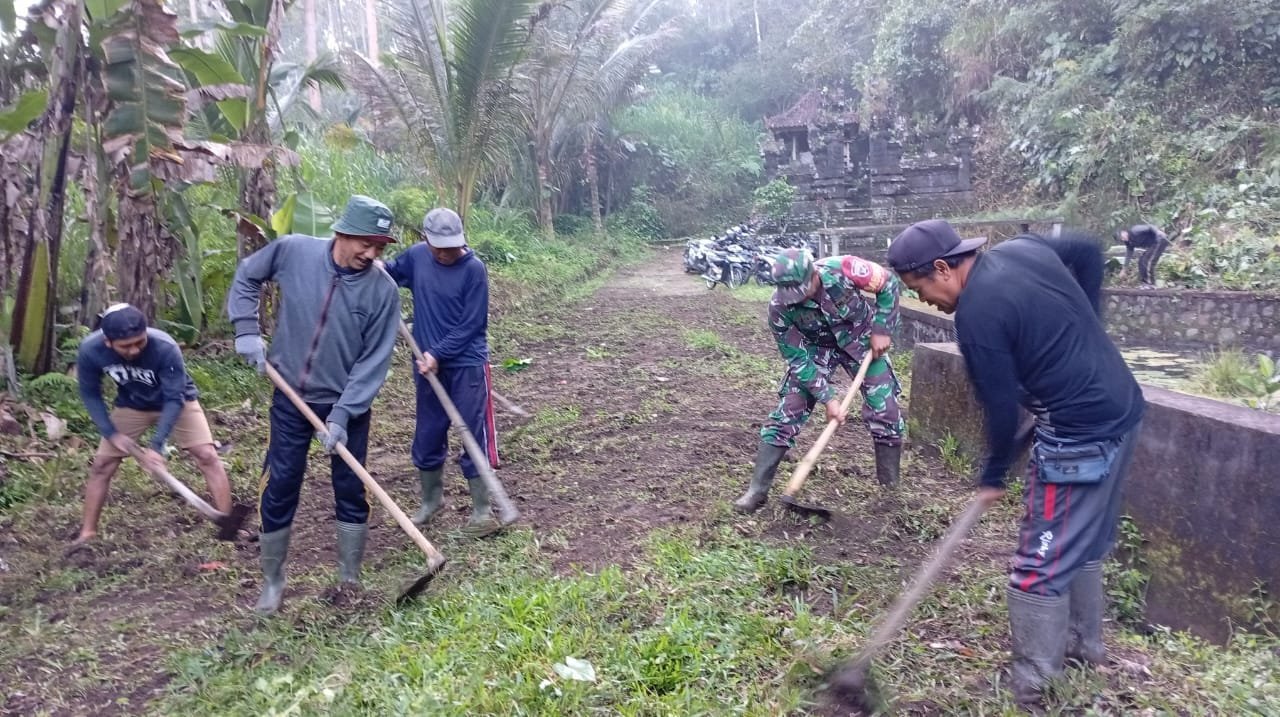 Bangli – Dalam rangka mewujudkan Kemanunggalan TNI dengan rakyat serta menumbuhkan semangat gotong-royong dan kepedulian masyarakat terhadap kebersihan lingkungan sekitar. Babinsa Desa Undisan Koramil 1626-03/Tembuku Kodim 1626/Bangli Serda I Wayan Budiarta bersama masyarakat bergotong royong bersihkan rumput liar serta pembersihan saluran air yang tersumbat lumpur bertempat di jalan menuju pura Beiji Banjar Undisan Kaja Desa Undisan Kecamatan Tembuku Kabupaten Bangli. minggu (20/07/2025)