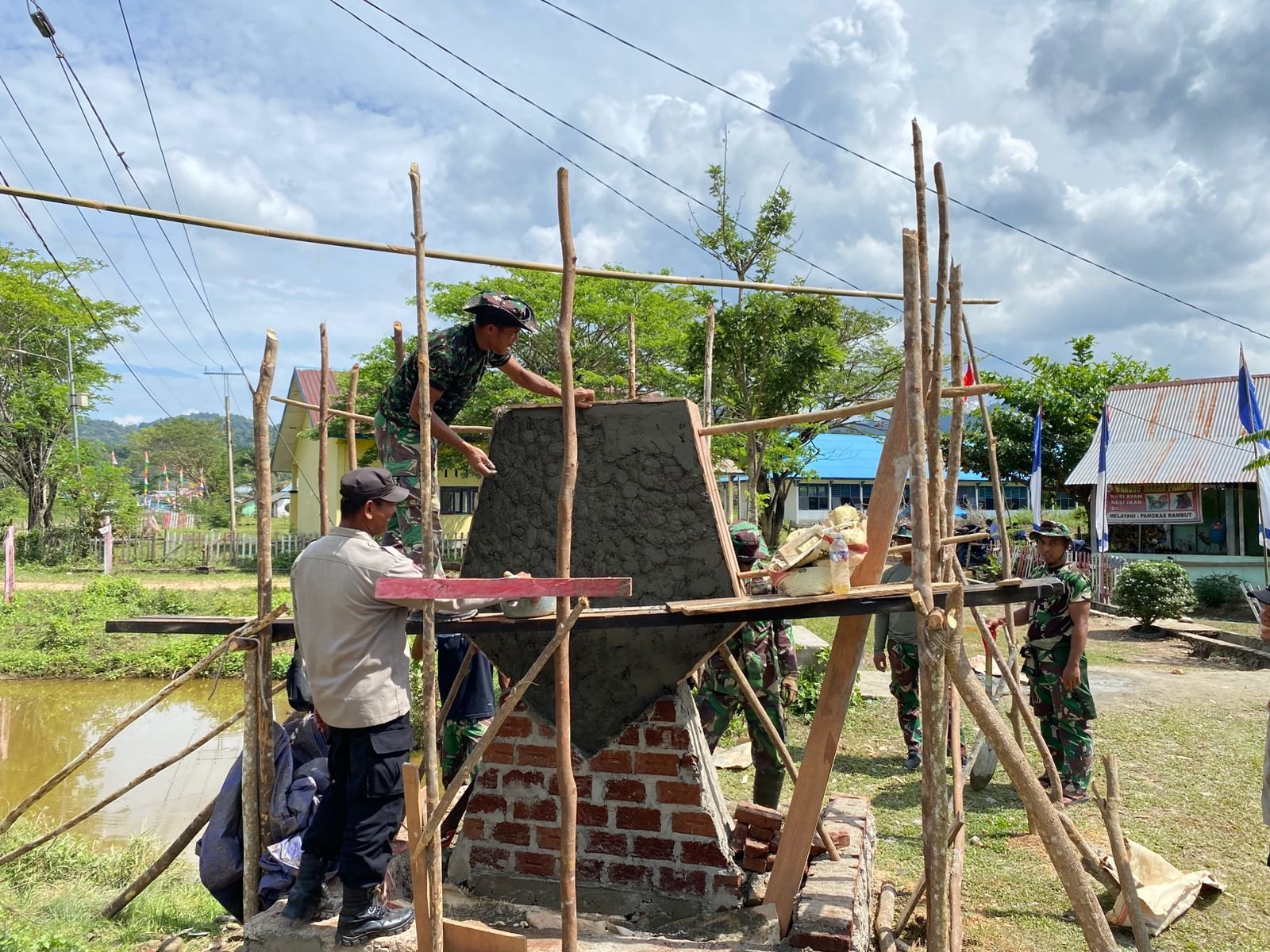 Pengerjaan tugu dilakukan dengan gotong royong. Anggota TNI, Polri, dan warga desa bahu-membahu mengangkut material, melakukan pengecoran, hingga tahap penyelesaian. Suasana kerja penuh semangat ini menjadi gambaran nyata kebersamaan di lapangan.