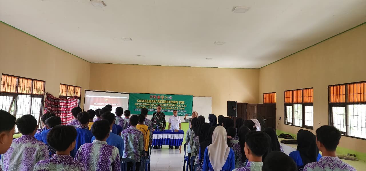 BARITO KUALA – Suasana Aula SMA Negeri 1 Wanaraya, Rabu (23/10) pagi, tampak berbeda dari biasanya. Puluhan siswa dan guru berkumpul antusias mengikuti sosialisasi rekrutmen prajurit TNI AD yang digelar Satgas TMMD ke-126 Kodim 1005/Barito Kuala.
