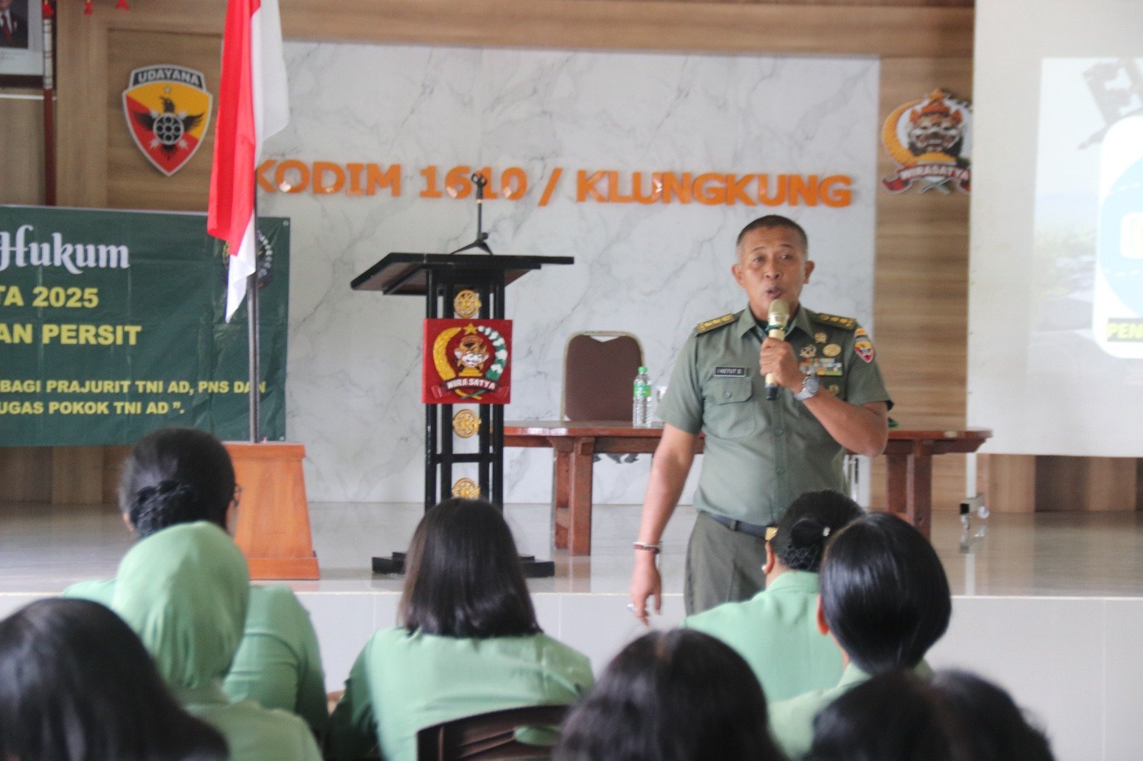 Klungkung, – Mengusung Tema :” Optimalisasi Kesadaran Hukum Bagi Prajurit TNI, PNS, Dan Keluarganya Guna Mendukung Tugas Pokok TNI AD” , prajurit, PNS dan Persit Kodim 1610/Klungkung menerima Penyuluhan Hukum Semester II TA. 2025, Rabu ( 05/11/25 ).