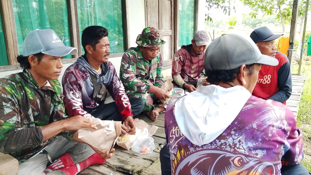 BARITO KUALA – Ada pemandangan menarik di sela pelaksanaan TMMD Ke-126 Kodim 1005/Barito Kuala di Desa Tumih, Kecamatan Wanaraya. Di tengah rindangnya pepohonan, anggota TNI bersama warga tampak menikmati makan siang sederhana. Mereka duduk melingkar di teras rumah, menikmati nasi bungkus dengan penuh keakraban.
