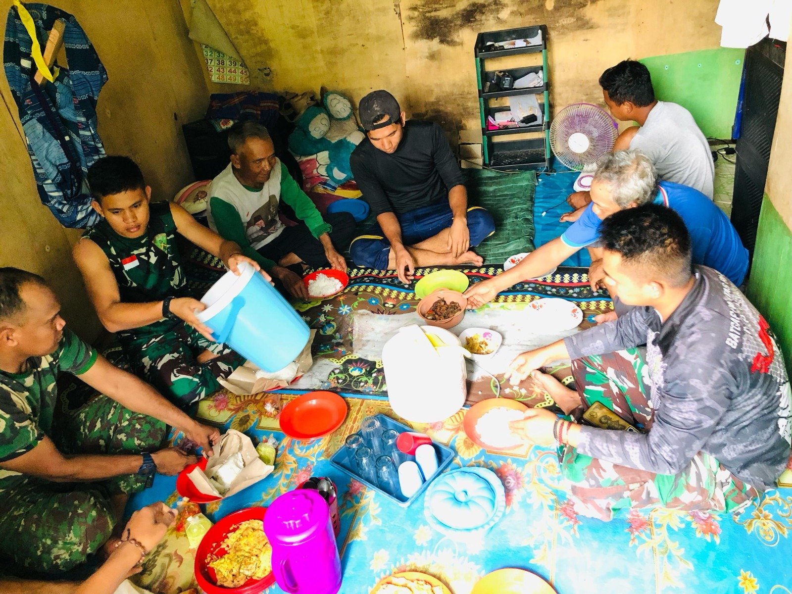 Tidak hanya dalam aktivitas fisik, keakraban juga tercermin dalam kehidupan sehari-hari. Warga dan personel TMMD tampak menikmati momen kebersamaan saat makan bersama, menciptakan suasana layaknya sebuah keluarga besar.