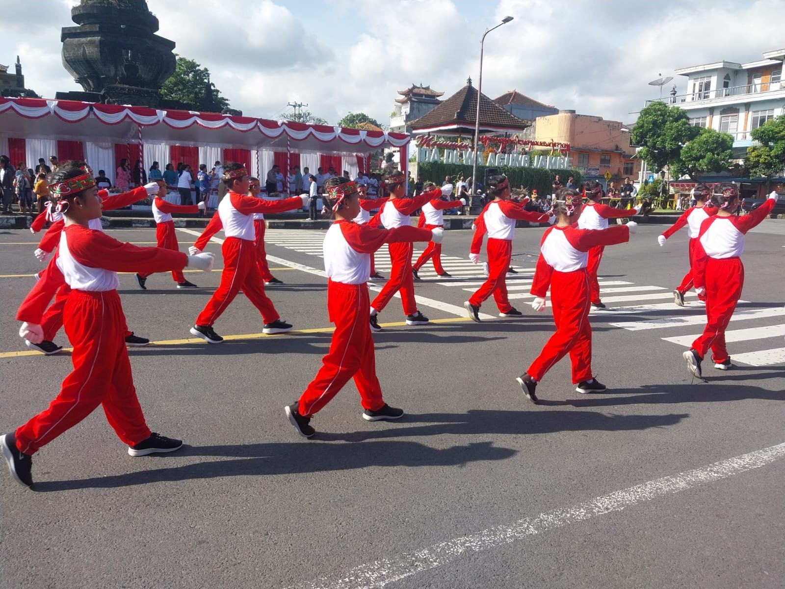 Rabu, ( 13/08/25 ) sore, kemeriahan tersebut kembali terlihat dengan digelarnya lomba gerak jalan indah tingkat SD yang digelar di depan Monumen Ida Idewa Agung Jambe.