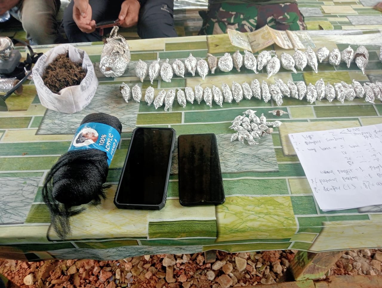 Dari hasil pemeriksaan di lapangan, petugas berhasil menemukan sejumlah barang bukti berupa ganja kering yang dikemas dalam berbagai ukuran, tiga unit handphone, dua unit sepeda motor, uang asing (kina), serta beberapa perlengkapan pribadi milik pelaku.