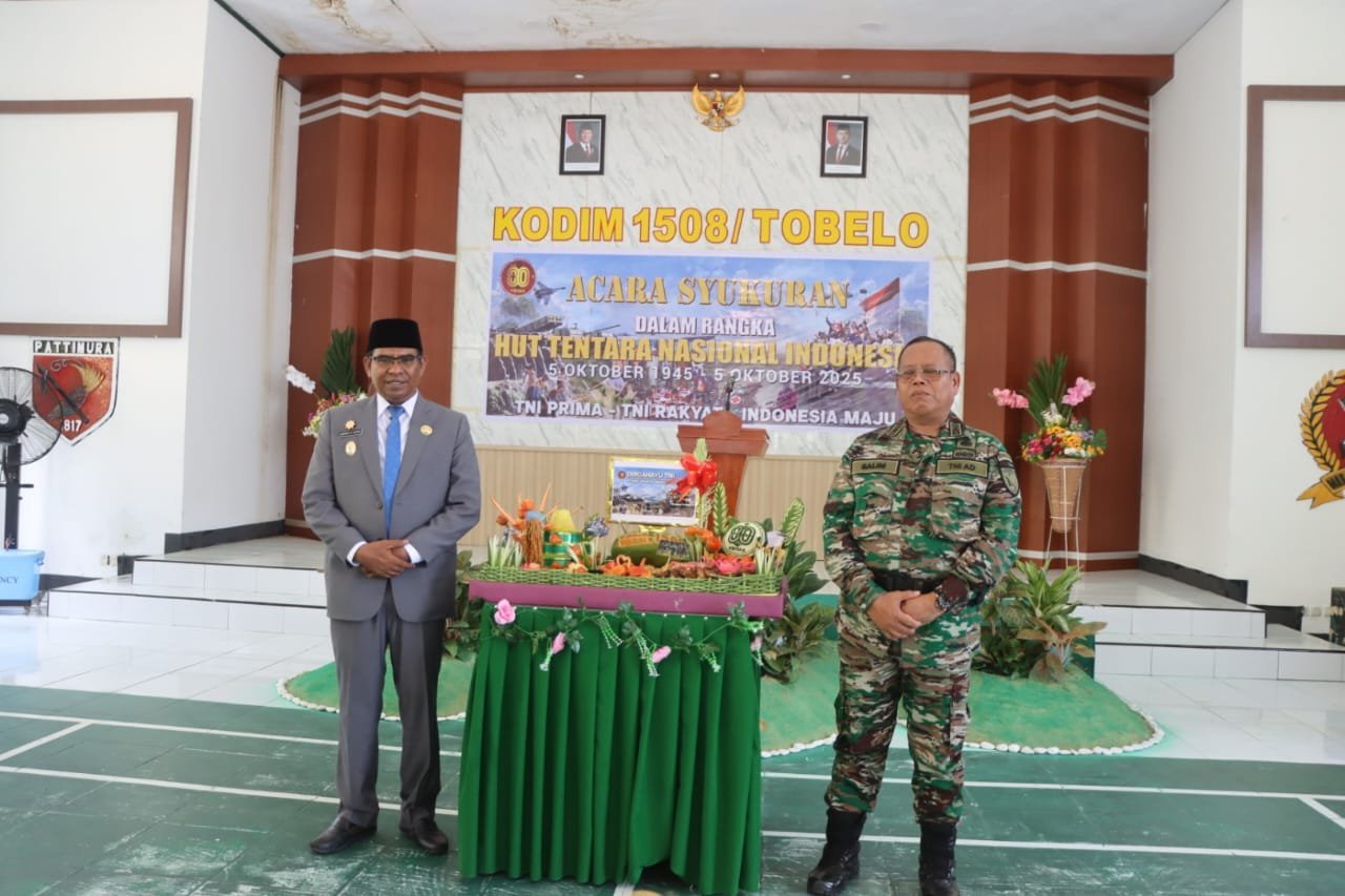 Halmahera Utara,– Komando Distrik Militer (Kodim) 1508/Tobelo menggelar acara syukuran dalam rangka memperingati Hari Ulang Tahun ke-80 Tentara Nasional Indonesia (TNI) bertempat di Aula Makodim 1508/Tobelo, Desa Mkcm, Kecamatan Tobelo, Kabupaten Halmahera Utara. Dengan mengusung tema “TNI Prima – TNI Rakyat – Indonesia Maju”, kegiatan ini dihadiri jajaran Forkopimda, tokoh masyarakat, serta segenap tamu undangan. Minggu (5/10/2025)