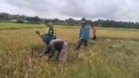 Dukung Pelaksanaan Program Ketahanan Pangan, Babinsa Koramil 02/Woyla Bantu Petani Panen Padi