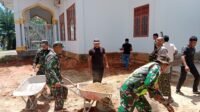 Jajaran Korem 012/TU dan warga desa Alue gani melaksanakan gotong royong meratakan pasir sekitaran mesjid