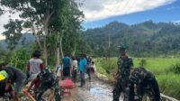 Tahap finishing ini menjadi bagian penting sebelum rumah diserahkan secara resmi kepada pemiliknya. Pengecatan dilakukan menggunakan cat dinding warna terang agar rumah lebih bersih, rapi, dan nyaman. Sementara itu, pintu dibuat langsung oleh personel Satgas menggunakan material kayu yang sudah dipotong dan dirakit di lokasi.