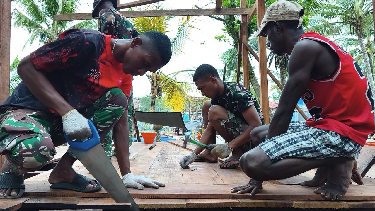 Mimika — Kepala tukang dari Satgas TMMD ke-128 Kodim 1710/Mimika, Pelda Edi Mangende, menjelaskan bahwa tahap lantai merupakan bagian yang sangat vital dalam pengerjaan rumah untuk warga.