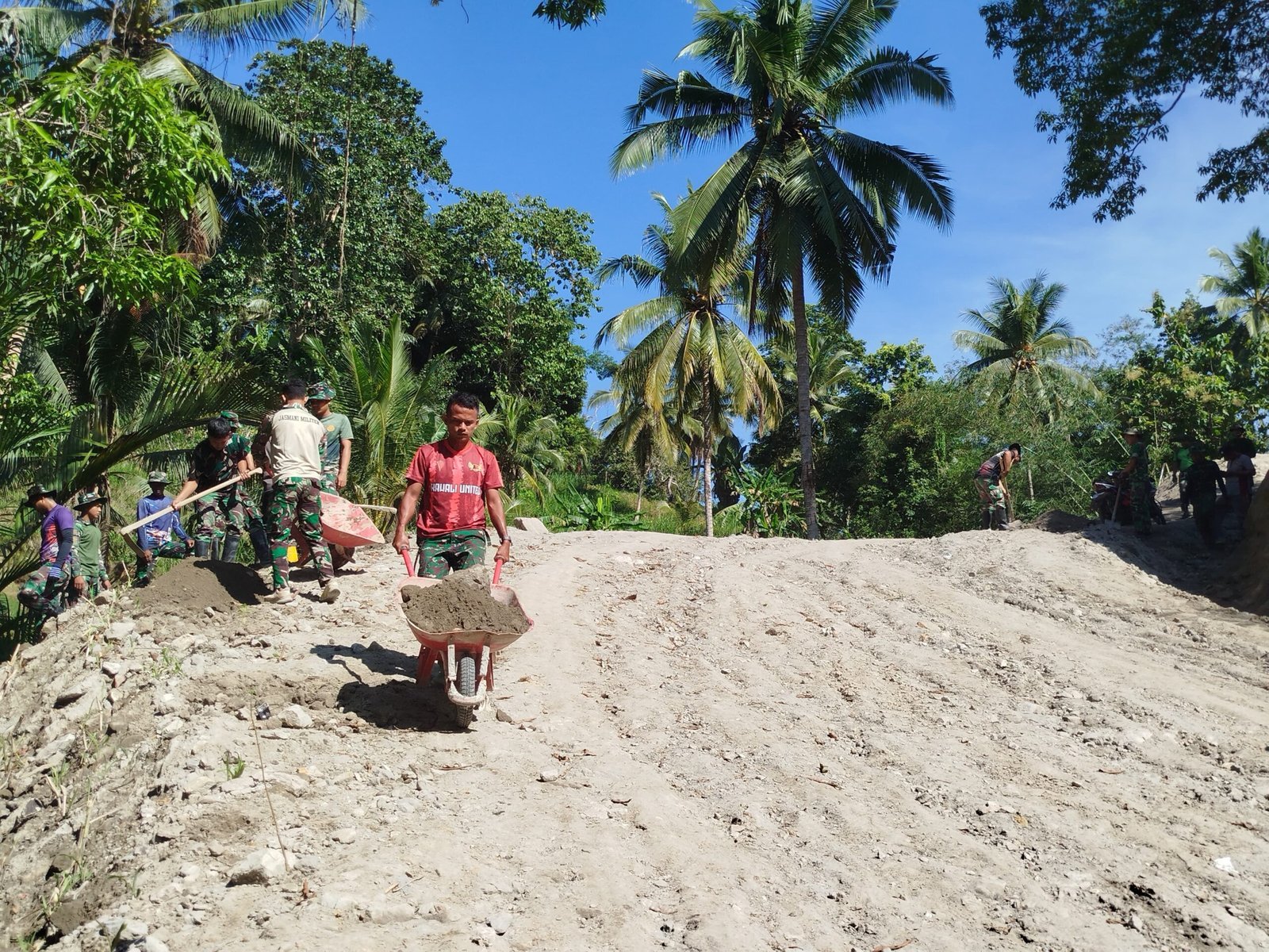 Dengan penuh dedikasi, para prajurit bahu-membahu mengerjakan pelebaran jalan dan pembangunan jembatan, yang menjadi bagian utama dari program TMMD kali ini. Meskipun cuaca panas dan kondisi fisik diuji karena berpuasa, mereka tetap menunjukkan loyalitas dan semangat pantang menyerah.