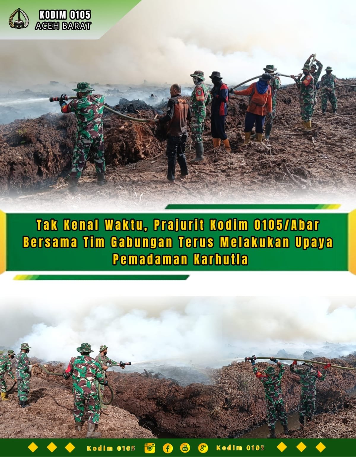 Tim gabungan yang terdiri dari prajurit Kodim 0105/Abar, BPBD Aceh Barat, dan Masyarakat Peduli Api desa setempat terus melakukan upaya pemadaman. Tanpa mengenal waktu dan tanpa mengenal lelah, mereka berjibaku memadamkan kobaran api yang masih menyala, meski dikepung asap tebal, pekat, dan menyengat.