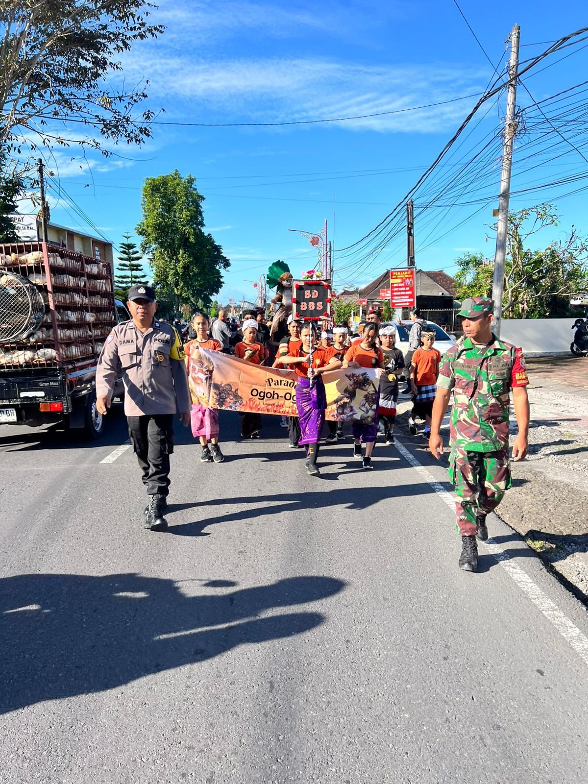 Bangli – Guna memberikan rasa aman serta memastikan kegiatan berjalan tertib dan lancar, Babinsa Kelurahan Bebalang Koramil 01/Bangli Kodim 1626/Bangli Kopda I Nengah Sudarma bersama Bhabinkamtibmas Kelurahan Bebalang Aiptu I Nyoman Dama melaksanakan pengawalan sekaligus pengamanan kegiatan Pawai Ogoh-ogoh tingkat SD dan TK Bali Bilingual School (BBS), kegiatan yang berlangsung di Jl. Raya Merdeka No. 150X, Lingk. Bebalang, Kel. Bebalang, Kec/Kab. Bangli. Selasa (17/3/26).
