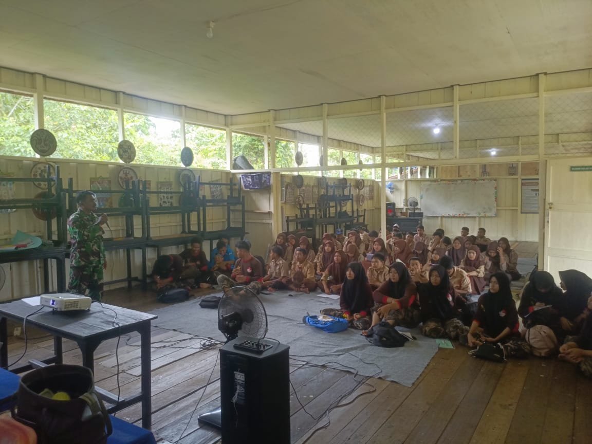 Kotawaringin Timur – Untuk menumbuhkan dan meningkatkan disiplin bagi anak usia dini yang mana merupakan pondasi generasi penerus bangsa, Babinsa Koramil 1015-03/Mentawa Baru ketapang Serma Nursudiono memberikan materi wawasan kebangsaan (Wasbang) kepada siswa-siswi SMP Meranti Mustika, Desa Ganepo, Kecamatan Seranau, Kabupaten. Kotawaringin Timur, Kamis (13/11/2025)