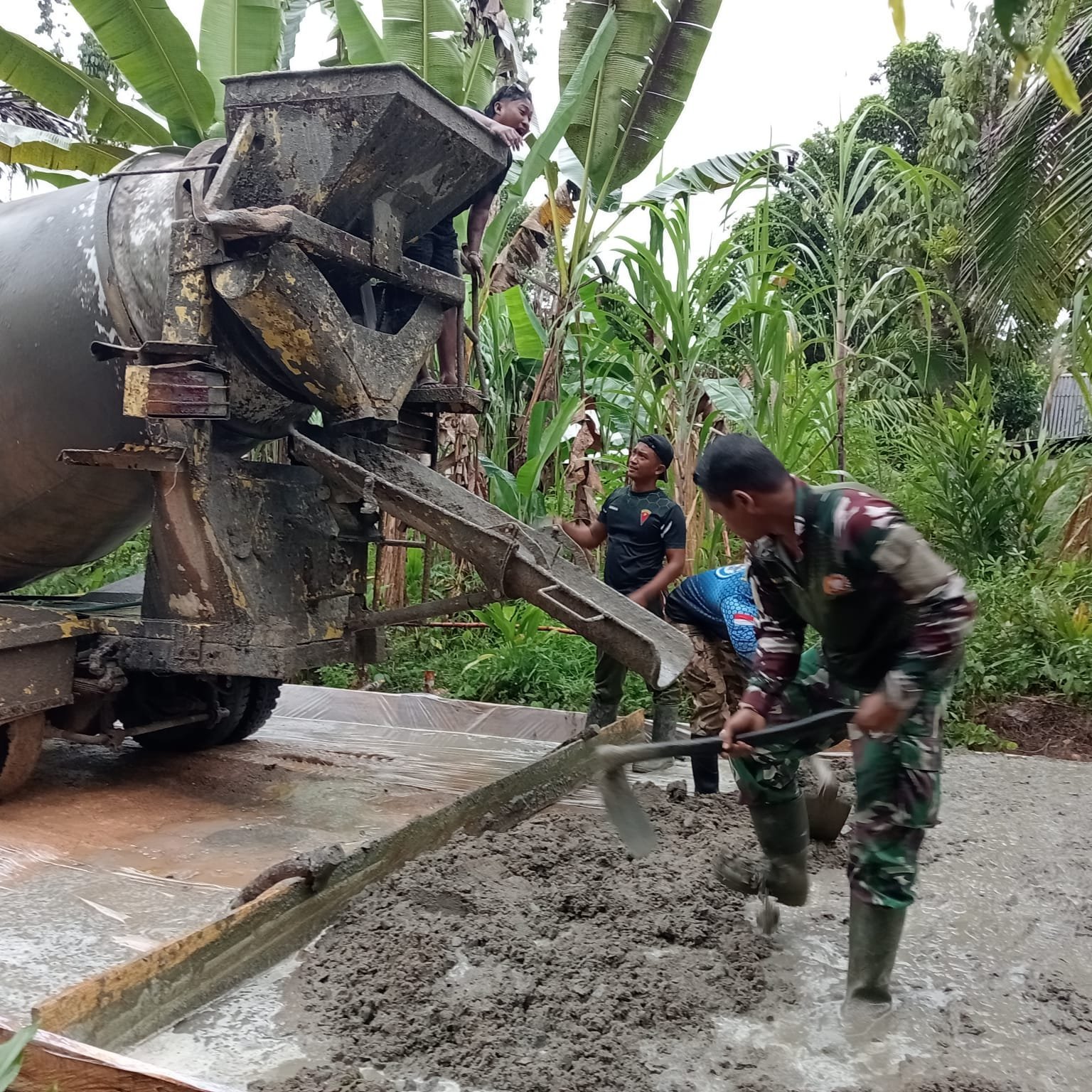 Semangat gotong royong begitu terasa di lokasi. Tampak anggota TNI dan warga saling bekerja sama, mulai dari mengangkut material, mencampur adukan semen, hingga meratakan permukaan jalan dengan penuh kekompakan.
