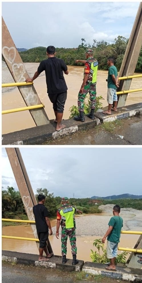 Tingkatkan Kewaspadaan terhadap Curah Hujan Tinggi Babinsa Koramil 01/Sungaimas Pantau Air Sungai di Desa Binaan