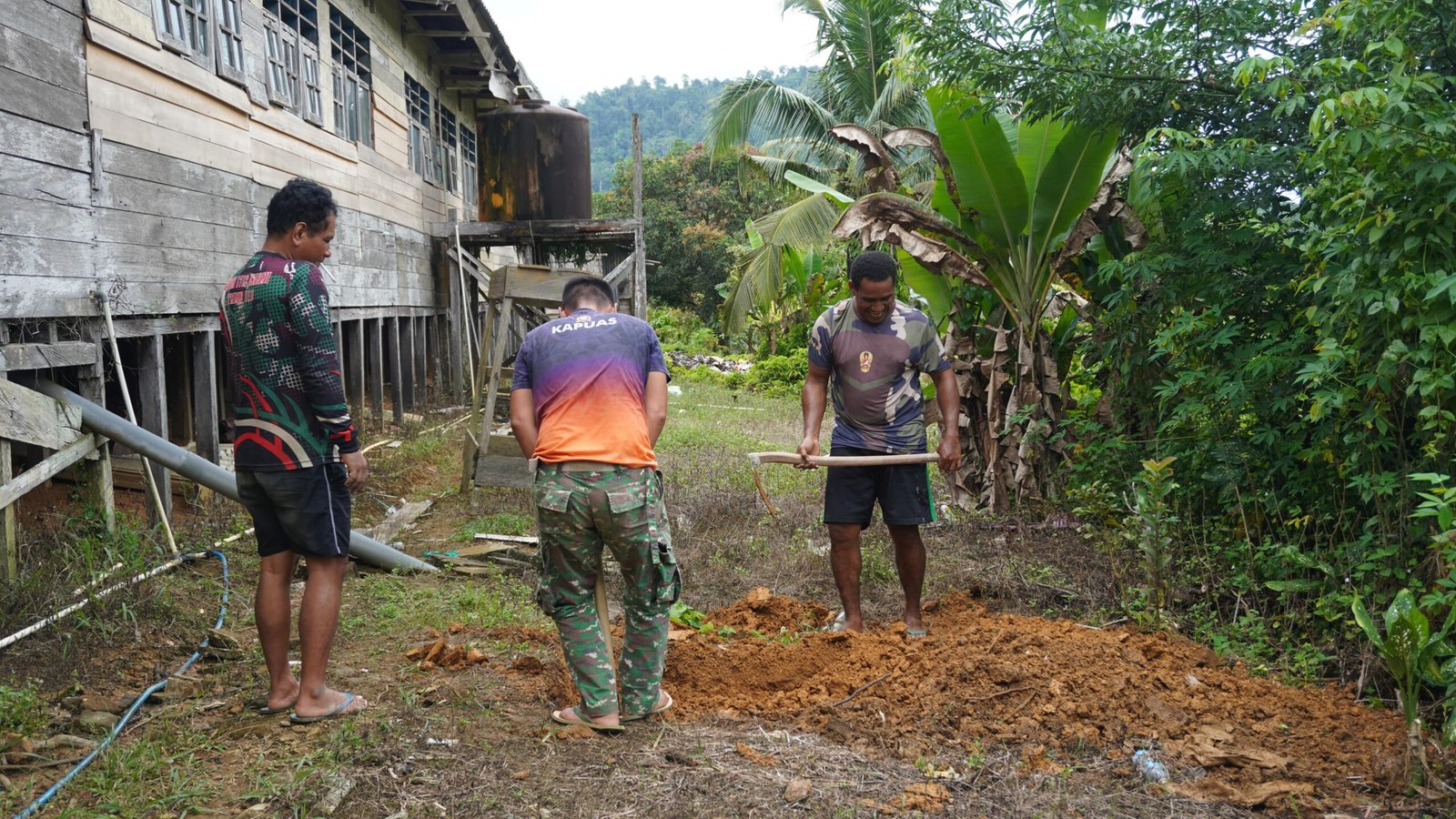 Kegiatan penggalian tanah menjadi tahap awal sebelum pemasangan instalasi septic tank. Proses ini dilakukan secara gotong royong antara anggota Satgas dan masyarakat sekitar.