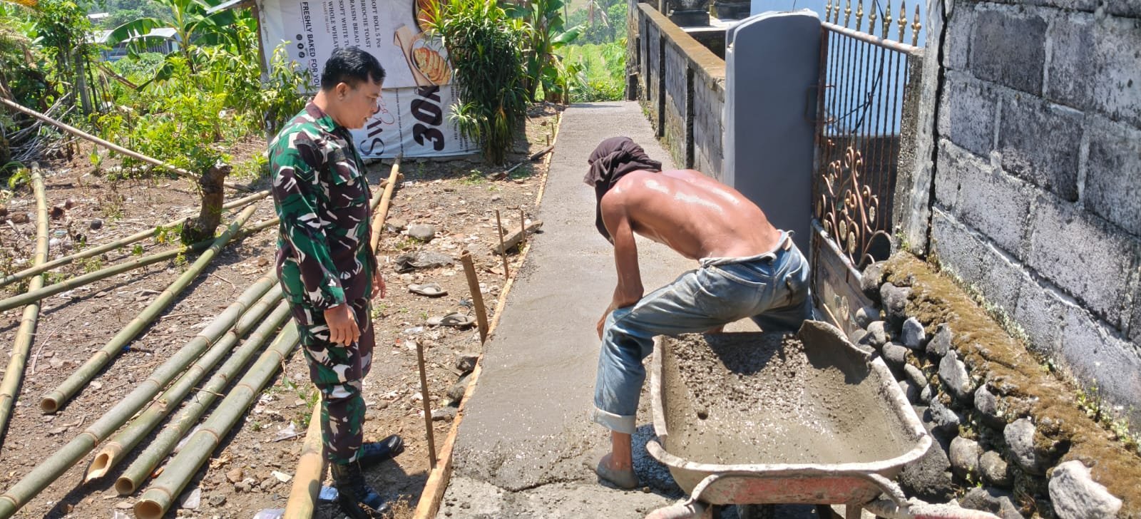 Hari ini kita mendampingi KBD Dusun Mengguna untuk melihat langsung progress perbaikan sekaligus pengecoran gang yang ada di wilayah Mengguna,”ucap Sertu Putu.