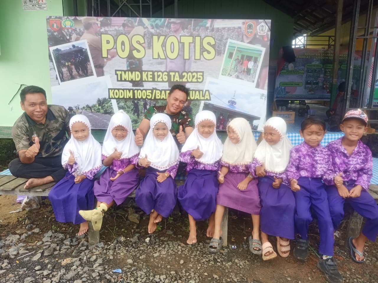 Dengan pakaian seragam ungu putih yang rapi, para bocah itu duduk berjajar sambil tersenyum malu-malu di samping anggota TNI. Pemandangan ini menjadi bukti nyata kedekatan antara Satgas TMMD dan warga sejak usia dini.