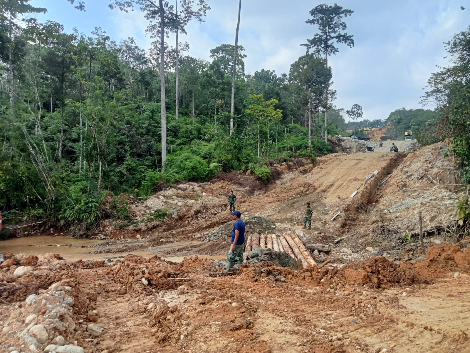 Di lokasi terlihat alat berat terus beroperasi untuk membantu proses pembentukan badan jalan, sementara sebagian personel lainnya mengerjakan bagian drainase serta pembuatan jembatan darurat.