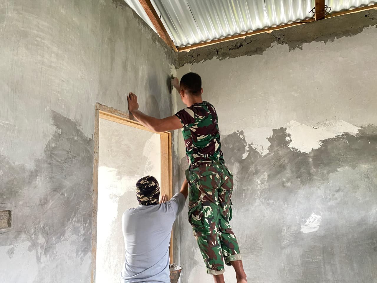 Pekerjaan difokuskan pada penguatan rangka bangunan serta perapian bagian dinding agar hasilnya lebih kokoh dan tahan lama. Partisipasi aktif warga dalam membantu proses pembangunan menjadi bukti kuatnya semangat kebersamaan antara TNI dan masyarakat.