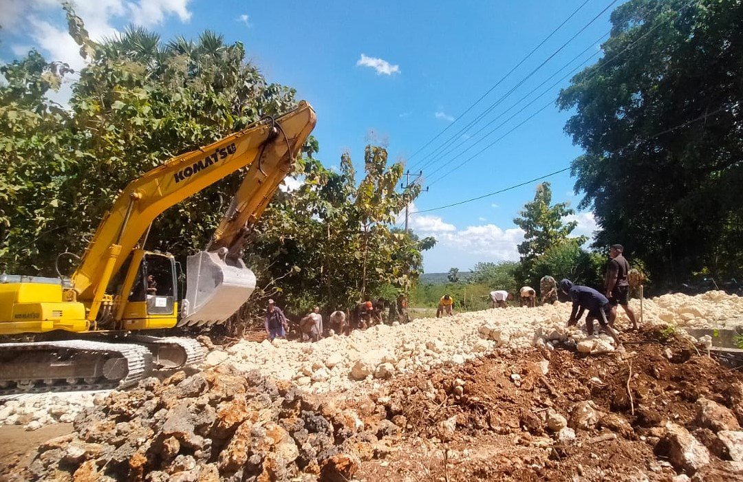 Anggota Satgas TMMD yang terdiri dari personel Kodim 1604/Kupang dan Yonif 744/SYB terus bekerja tanpa mengenal lelah. Mereka bergotong royong bersama warga setempat dan alat berta exsa dengan semangat juang tinggi, menyelesaikan pekerjaan hari ini berupa pemerataan dan perapian timbunan sirtu di sepanjang badan jalan sepanjang 1,4 kilometer dengan lebar tiga meter.