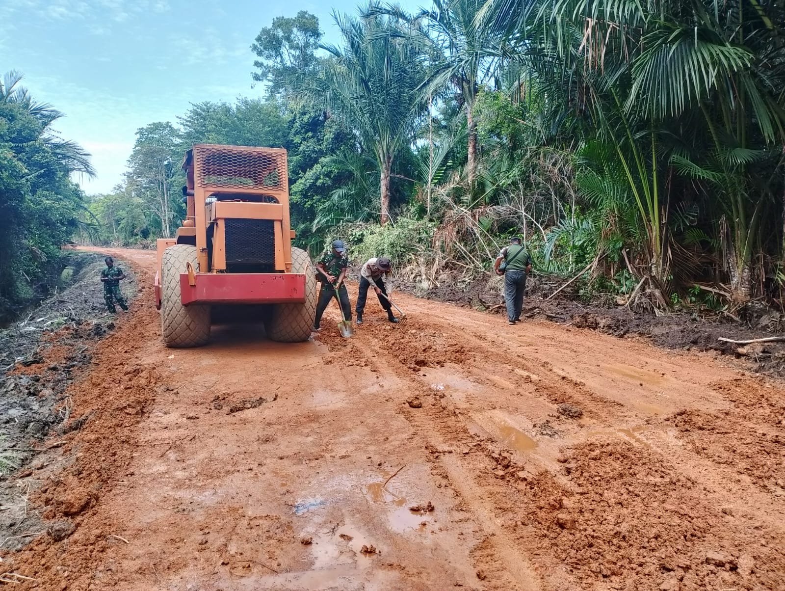 Kondisi tanah yang sedikit basah akibat hujan tidak menjadi hambatan berarti bagi para personel TNI dan warga yang terlibat. Alat berat jenis wales telah dikerahkan untuk menggilas tanah merah yang digunakan sebagai material urug, guna mempercepat proses pemadatan badan jalan.
