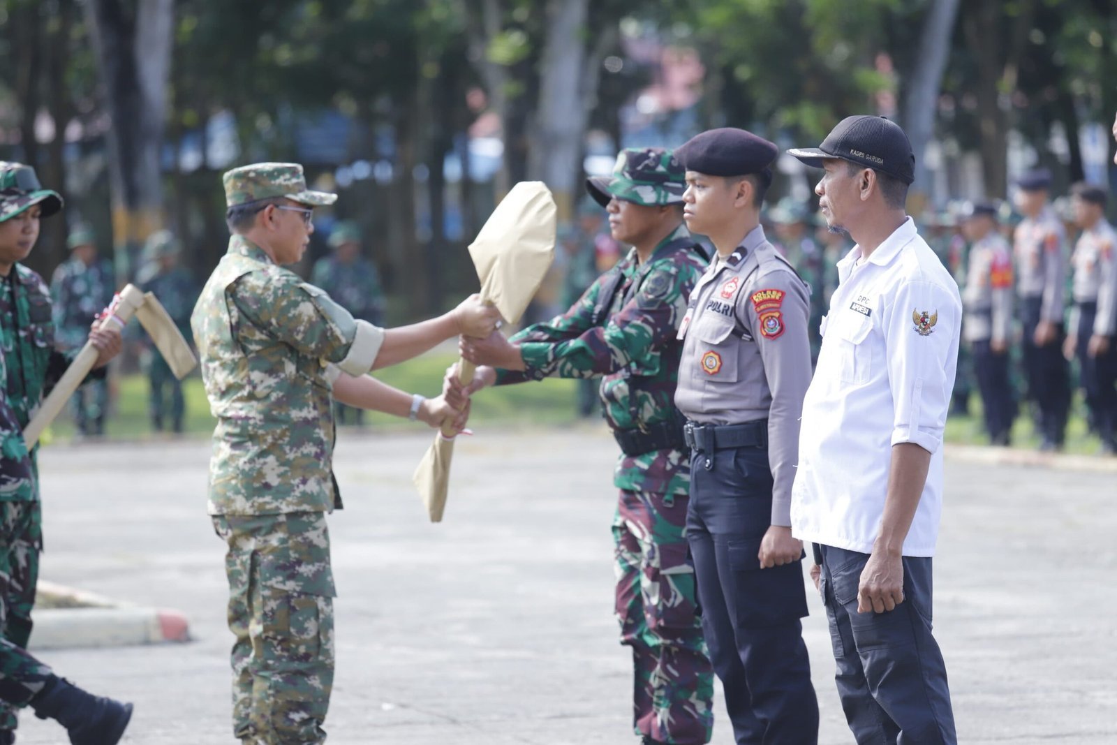 Sebagai penanda resmi dimulainya kegiatan TMMD ke-125, Bupati Konawe, H. Yusran Akbar, ST, menyerahkan secara simbolis alat kerja kepada perwakilan Satgas TMMD. Penyerahan ini menjadi simbol kesiapan seluruh pihak dalam menyukseskan kegiatan pembangunan fisik maupun nonfisik yang akan dilaksanakan di lokasi sasaran.
