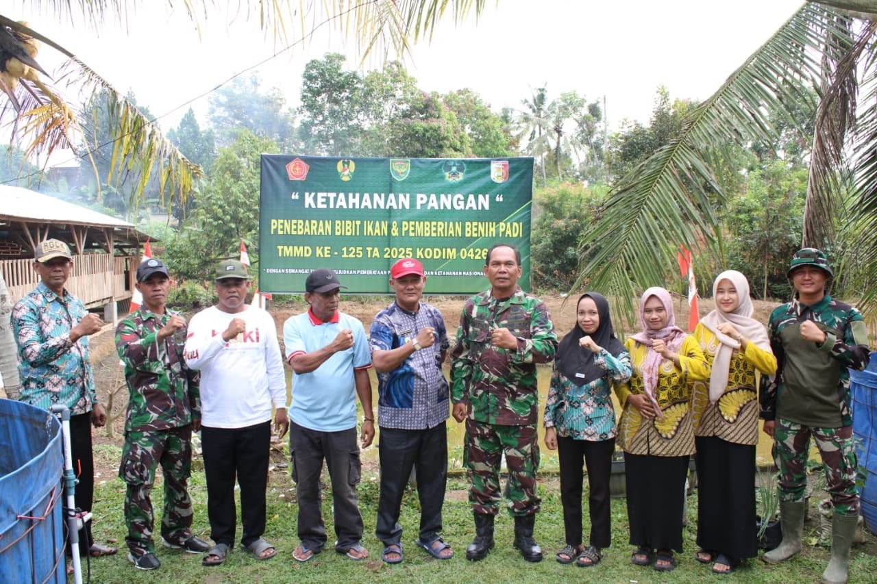 Tulang Bawang, 14 Agustus 2025 – Program TNI Manunggal Membangun Desa (TMMD) ke-125 Kodim 0426/Tulang Bawang terus menunjukkan kepeduliannya terhadap kemandirian pangan warga. Kali ini, Satgas TMMD melaksanakan kegiatan ketahanan pangan berupa penebaran 3.000 bibit ikan lele di kolam warga Kampung Moris Jaya, Kecamatan Banjar Agung, Kamis (14/8/2025).