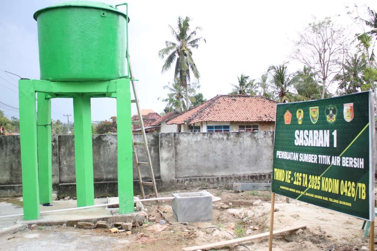 Tulang Bawang, 13 Agustus 2025 – Pembangunan sumber titik air bersih pada sasaran 1 TMMD ke-125 Kodim 0426/Tulang Bawang di Kampung Moris Jaya, Kecamatan Banjar Agung, resmi rampung 100 persen. Fasilitas vital ini diharapkan mampu meningkatkan kualitas hidup masyarakat dengan akses air bersih yang lebih mudah dan terjangkau.