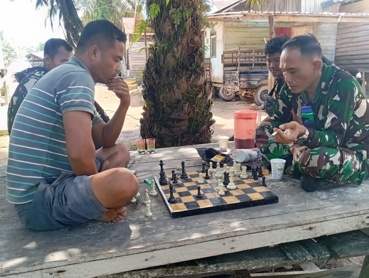 Di sela-sela waktu istirahat, anggota Satgas memanfaatkan momen untuk bermain catur bersama warga desa. Aktivitas sederhana ini menciptakan keakraban, tawa, dan kebersamaan yang hangat, menegaskan semangat kemanunggalan TNI dengan rakyat.