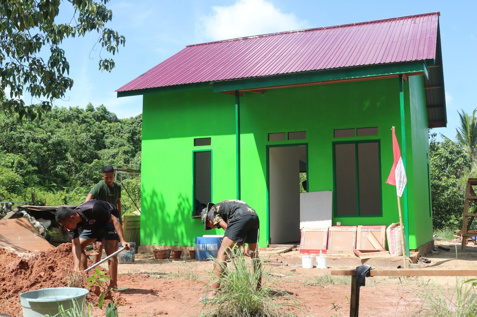 KUTAI TIMUR – Di tengah riuh suara gesekan semen dan ketukan palu, rumah Rahman di Desa Suka Rahmat, Kecamatan Teluk Pandan, perlahan menjelma bak istana kecil berbalut warna hijau segar. Prajurit TNI dengan seragam lorengnya bekerja seperti pemahat yang tengah merapikan karya terakhirnya—lantai keramik putih yang kini menggantikan tanah becek di musim hujan dan debu tebal saat kemarau.