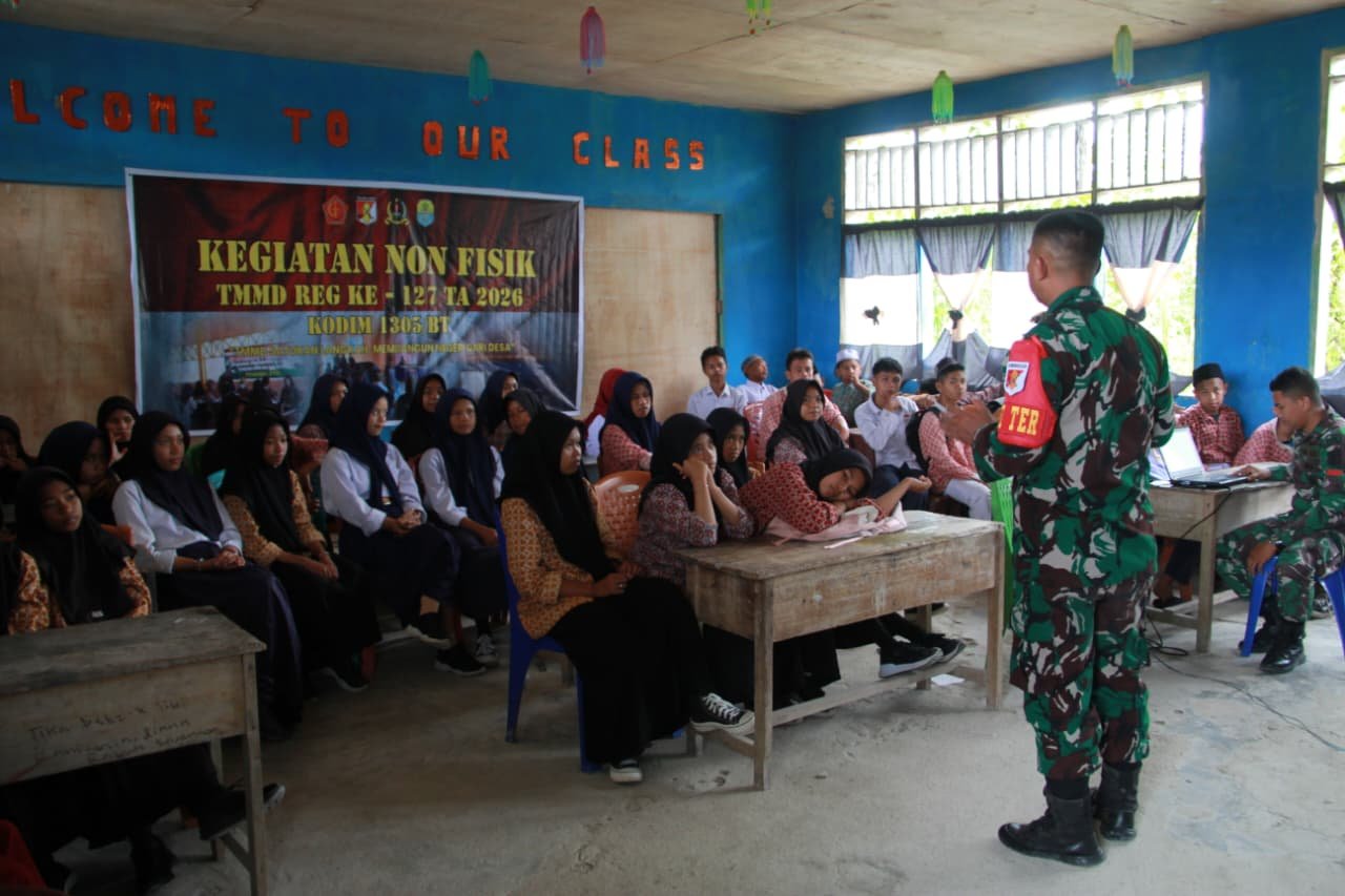 Tolitoli – Program TNI Manunggal Membangun Desa (TMMD) Ke-127 Tahun Anggaran 2026 tidak hanya berfokus pada pembangunan fisik, tetapi juga menyentuh kegiatan nonfisik melalui penyuluhan Wawasan Kebangsaan (Wasbang) kepada para pelajar di MTS Al-Maruf Dusun Ogomolobu, Desa Oyom, Kecamatan Lampasio, Kabupaten Tolitoli, Selasa (11/02/2026).