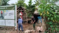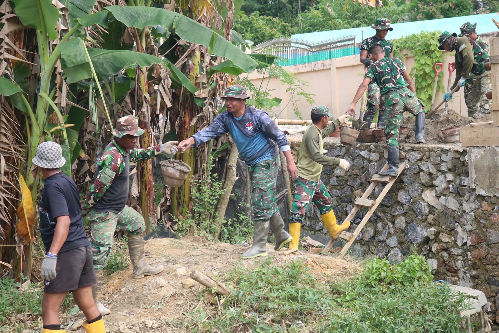 Personel TNI bersama warga setempat tampak kompak menyusun material demi menghadirkan struktur yang kokoh untuk mengantisipasi abrasi maupun potensi tanah longsor di area tersebut.