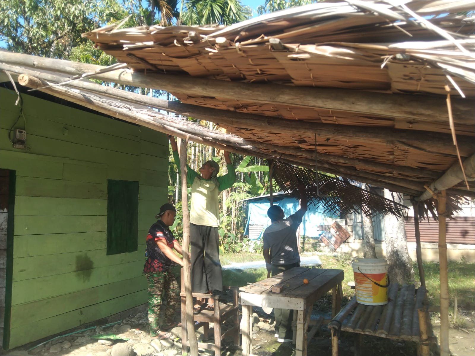 Di tengah suara palu yang bersahutan, anggota Satgas TMMD bersama masyarakat bekerja seperti satu keluarga. Papan dinding lama diganti, bagian rumah diperkuat, sementara teras yang dulunya beratap daun akan diganti dengan material yang lebih kokoh.