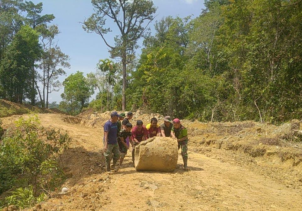 Seperti roda besar yang digerakkan oleh semangat gotong royong, gorong-gorong itu digulingkan perlahan di atas badan jalan yang masih berupa tanah timbunan. Beberapa anggota satgas berada di sisi kanan kiri, sementara lainnya menahan putaran menggunakan tali agar tidak melaju liar di turunan jalan.