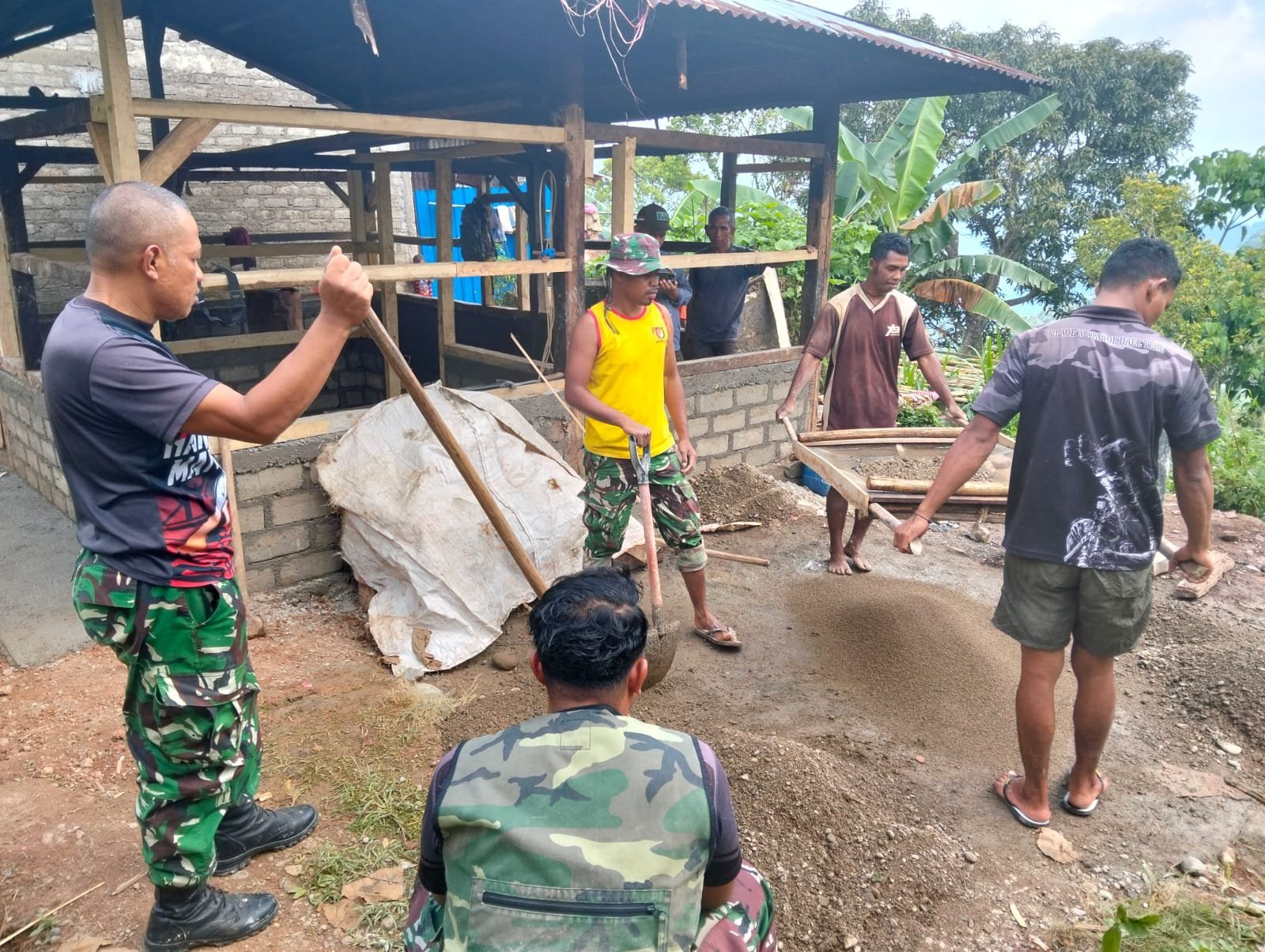 Sejak pagi, suara palu, gergaji, dan adukan semen terdengar bersahutan di halaman rumah Heribertus. Beberapa prajurit tampak sibuk menata batu bata, sementara warga lainnya bergantian membawa material bangunan. Pemandangan penuh semangat ini mencerminkan eratnya kemanunggalan antara TNI dan rakyat dalam mewujudkan hunian yang lebih layak dan manusiawi bagi keluarga Heribertus.