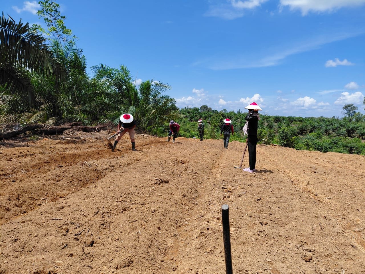 Bertempat di Desa Batu Kotam, Kecamatan Bulik, Kabupaten Lamandau, Satgas TMMD bersama masyarakat melaksanakan kegiatan pengolahan lahan dan penanaman jagung di area pertanian yang telah disiapkan. Program ini menjadi langkah nyata TNI dalam mendukung pemerintah daerah untuk memperkuat sektor pangan masyarakat pedesaan.