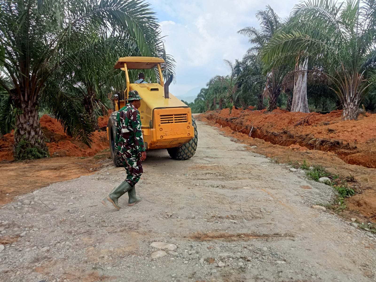 Pada Selasa (10/3/2026), aktivitas pengerjaan terlihat semakin intens dengan keterlibatan anggota Satgas yang mengawasi proses pemadatan jalan.