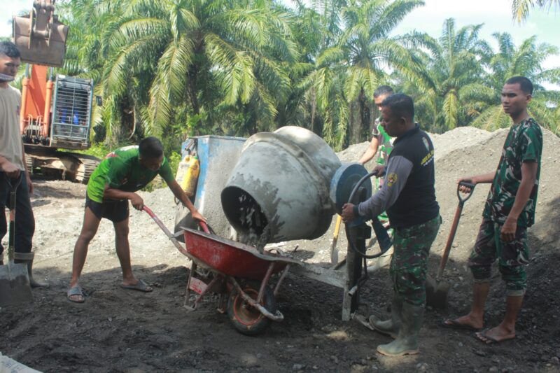Danposramil Tripa Makmur Peltu Iputu Bisma menyampaikan kegiatan kali ini adalah pengecoran untuk memperkokoh jembatan aramco yang telah di pasang di bawahnya ucap Danposramil Tripa Makmur.(Pr012).