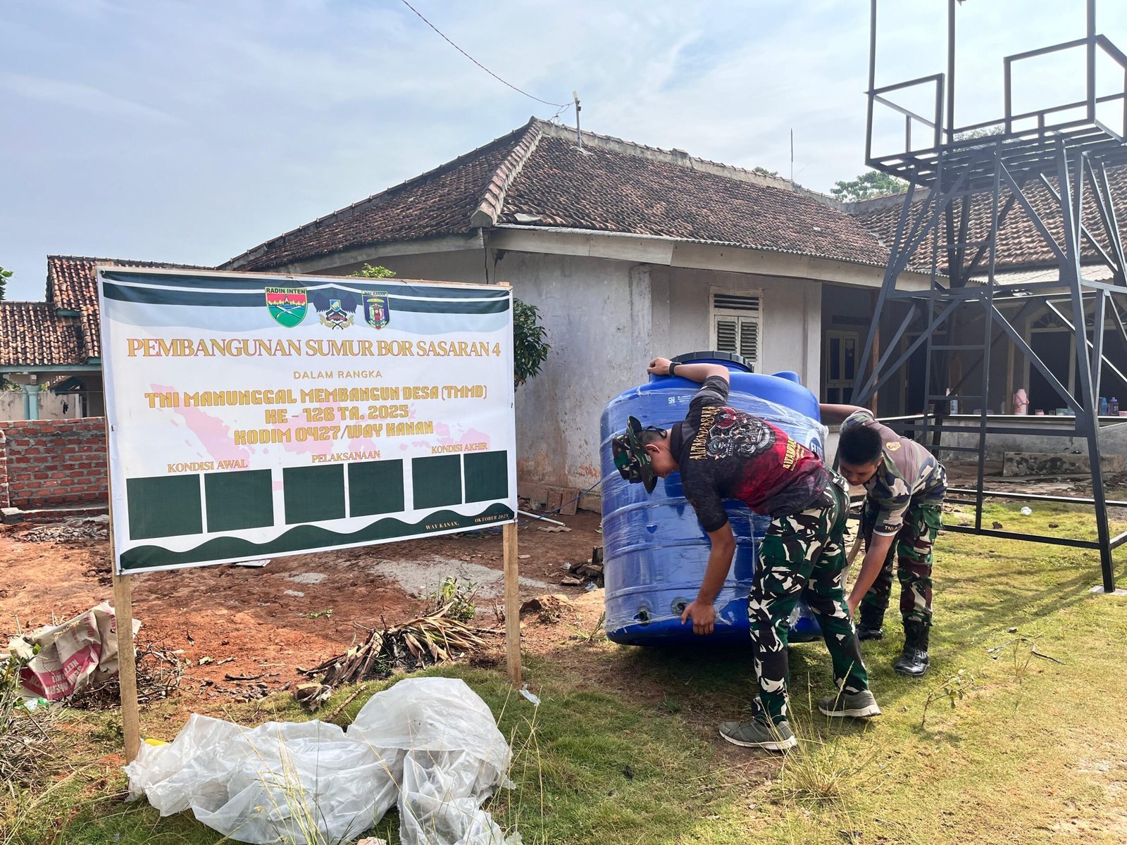 Way Kanan, Selasa (21/10/2025) – Personel Satgas TNI Manunggal Membangun Desa (TMMD) ke-126 Kodim 0427/Way Kanan bersama masyarakat Dusun 1 RT 003 Kampung Sriwijaya, Kecamatan Umpu Semenguk, Kabupaten Way Kanan, melaksanakan kegiatan pemasangan tower air sumur bor sebagai bagian dari sasaran fisik TMMD tahun 2025.