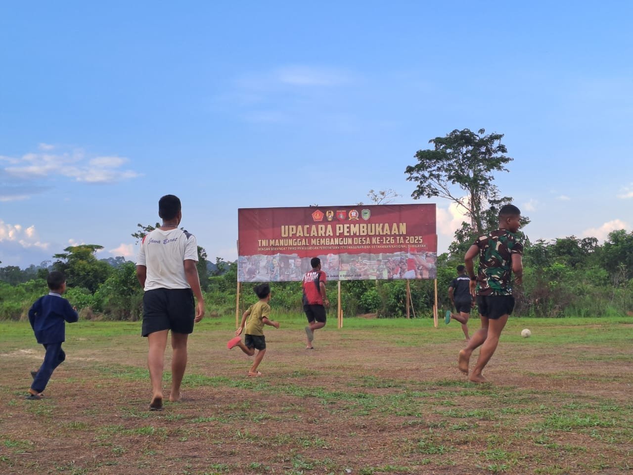 Barito Utara – Bentuk nyata kemanunggalan TNI dengan rakyat kembali tampak dalam rangkaian kegiatan TMMD ke-126 Kodim 1013/Muara Teweh yang berlangsung di Desa Jamut, Kecamatan Teweh Timur, Senin (03/11/2025). Seusai melaksanakan pekerjaan fisik, anggota Satgas TMMD menyempatkan diri bermain sepak bola bersama anak-anak desa.