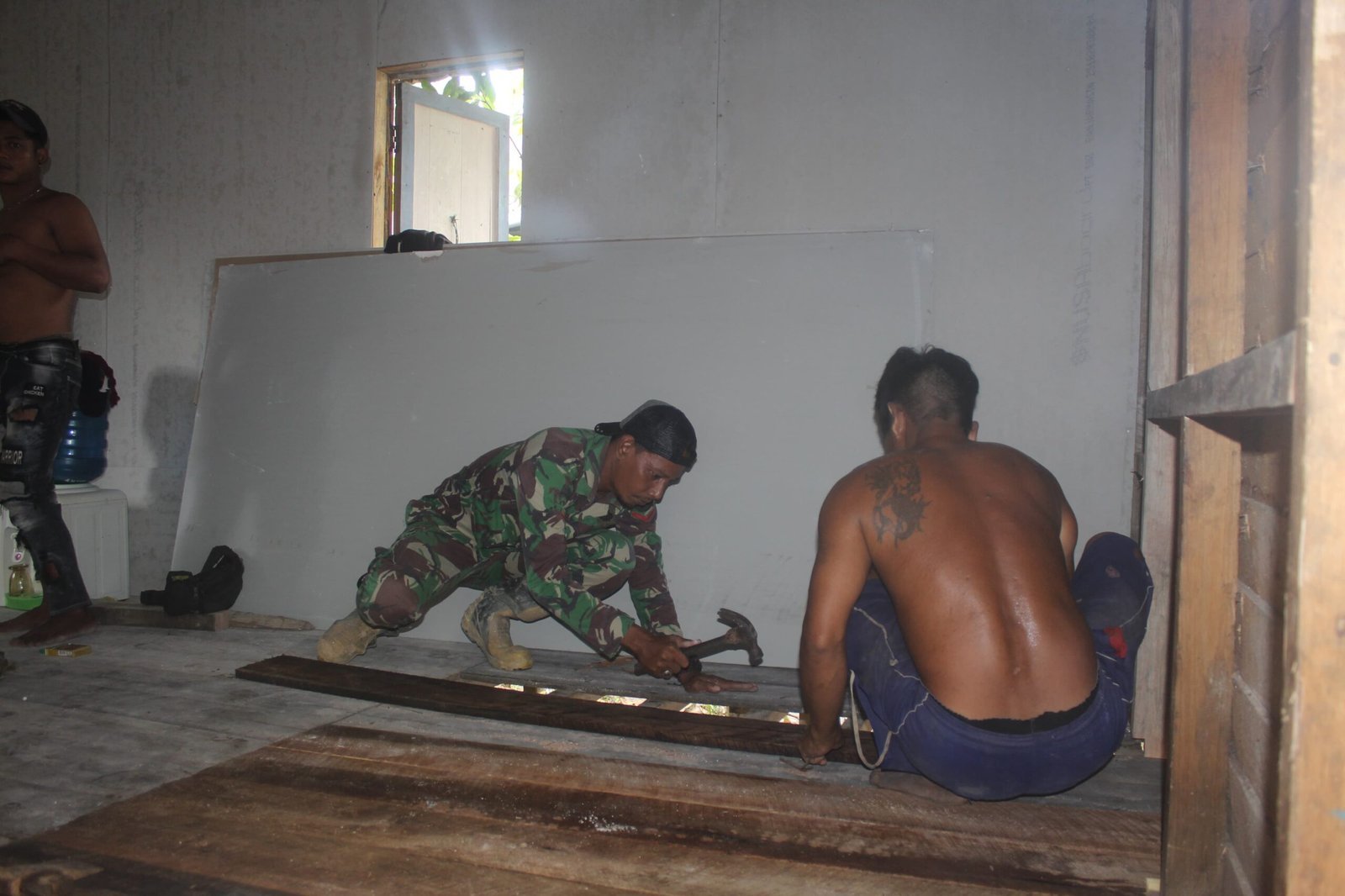 Kegiatan pemasangan lantai ini dilakukan secara gotong royong oleh Satgas TMMD dan warga sekitar. Proses ini merupakan tahap lanjutan setelah dinding dan atap rumah selesai diperbaiki.
