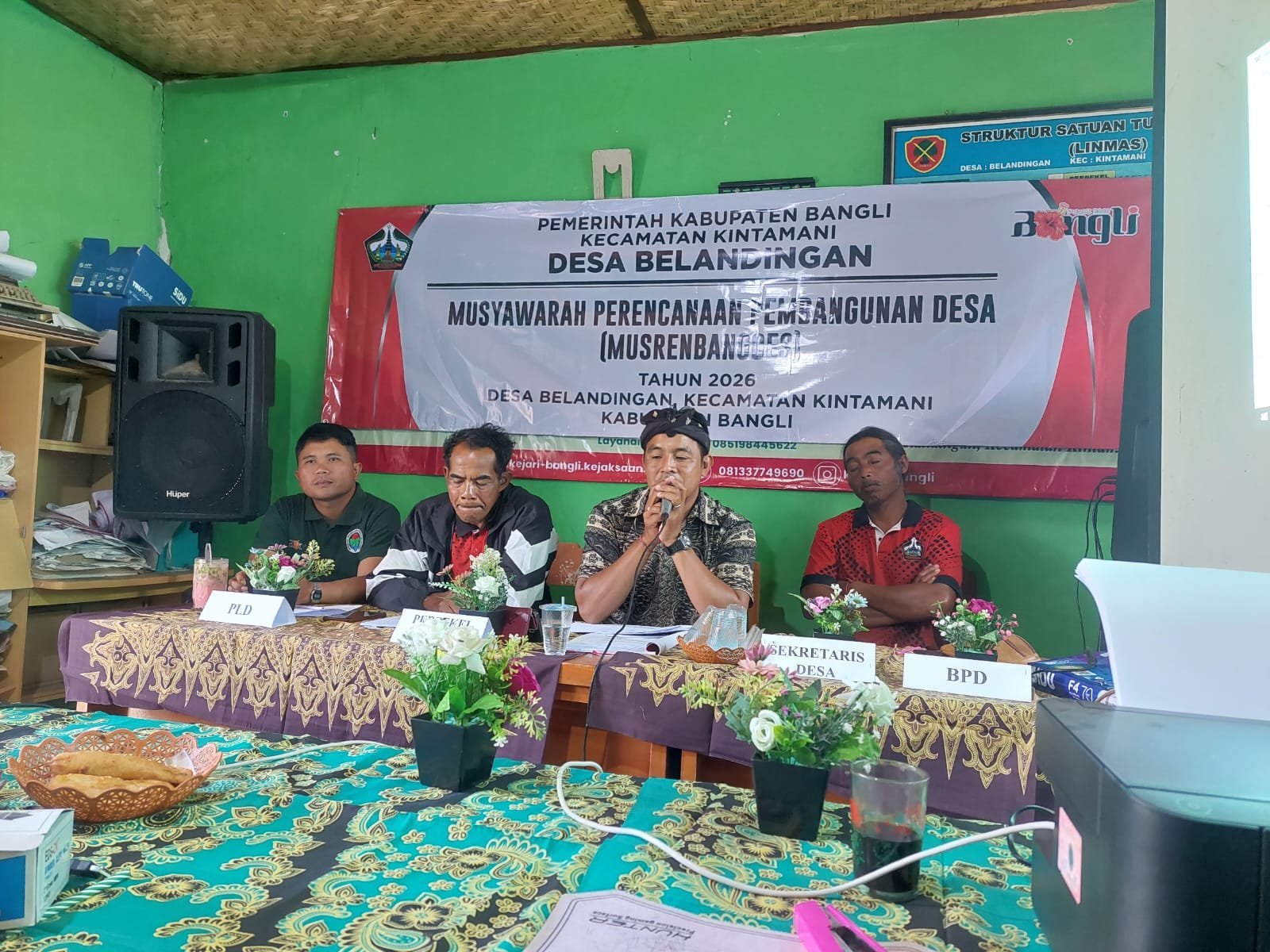 Kegiatan tersebut membahas dan menetapkan Rencana Kerja Pemerintah (RKP) Desa Tahun 2026. Turut hadir dalam kegiatan antara lain Prebekel Desa Belandingan, Ketua dan Anggota BPD, Ketua LPM, para Kadus, Pendamping Desa, Kepala Sekolah SD dan TK, serta tokoh masyarakat setempat.