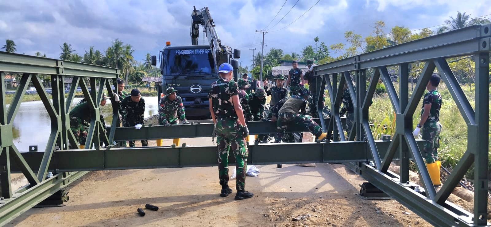 Tahapan pengerjaan di lapangan saat ini memasuki fase krusial, yakni pemasangan panel jembatan secara berkesinambungan dari tepi satu ke tepi lainnya. Di bawah pengawasan teknis yang ketat, para prajurit juga secara paralel melakukan pemasangan lantai jembatan guna memastikan struktur atas siap difungsikan. Ketepatan dan kecepatan menjadi kunci utama dalam setiap perakitan komponen baja agar jembatan ini memiliki daya tahan maksimal bagi kendaraan yang melintas kelak.