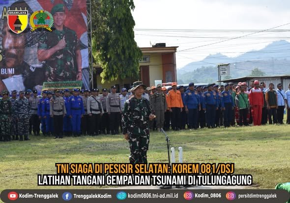 Tulungagung – Dalam upaya memperkuat kesiapsiagaan terhadap potensi bencana alam di wilayah selatan Jawa Timur, Korem 081/Dhirotsaha Jaya (DSJ) Kodam V/Brawijaya menggelar Latihan Lapangan Penanggulangan Bencana Alam Gempa Bumi dan Tsunami Tahun Anggaran 2025, Senin (27/10/2025). Kegiatan berlangsung di kawasan Pantai Popoh dan Pantai Sidem, Kecamatan Besuki, Kabupaten Tulungagung, dengan melibatkan unsur gabungan dari TNI, Polri, BPBD, Basarnas, Dinas Kesehatan, Damkar, PMI, hingga relawan masyarakat.